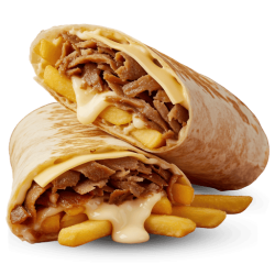 Shoarma, frietjes, smelt kaas, ui, paprika, champignons, saus