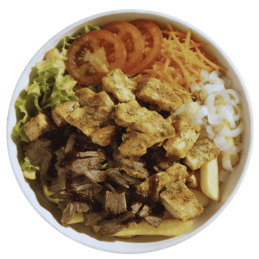Kip, frietjes, smelt kaas, ui, paprika, champignons, saus